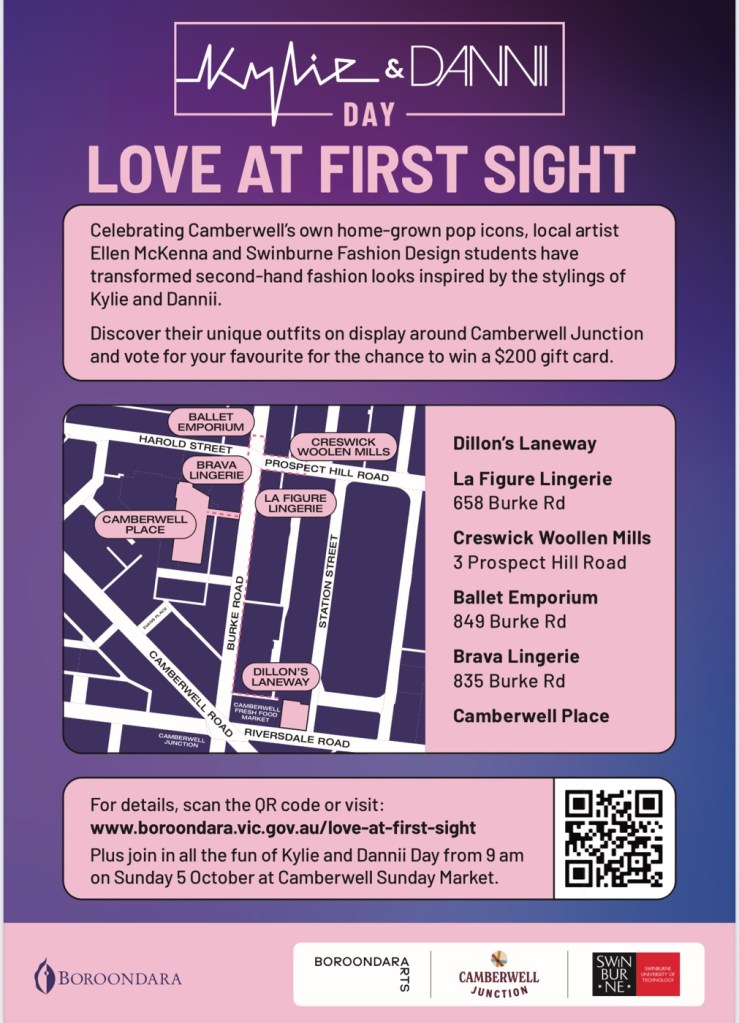 Celebrating Camberwell’s own Kylie and Dannii Day, local artist Ellen McKenna and Swinburne Fashion Design students have transformed second-hand fashion looks inspired by the stylings of Kylie and Dannii. Discover 10 unique outfits on display around Camberwell and vote for your favourite for a chance to win a $200 gift card.