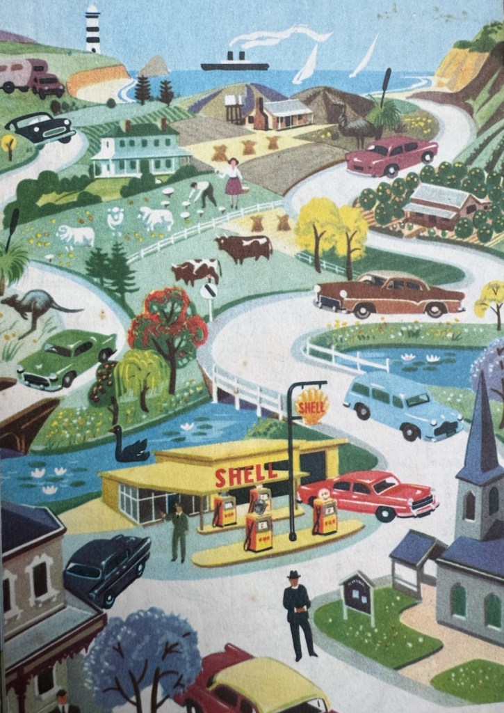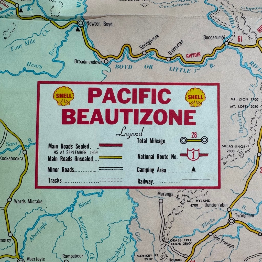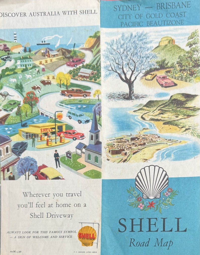 This 1960’s collectible Shell road map is a classic example for “Sydney and Environs” embraces the happy motoring experience and romance of early motoring. Measured in miles, this map can be dated to the pre-1974 change to kilometres.