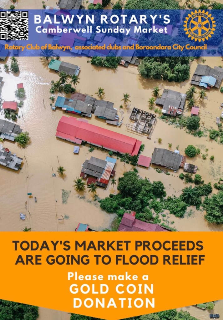 On Sunday 27 March 2022 all market proceeds will be donated to flood relief. The Rotary Club of Balwyn and associated clubs will be collecting gold coin donations at market entry points, so please join us this weekend and contribute generously to this worthy cause.