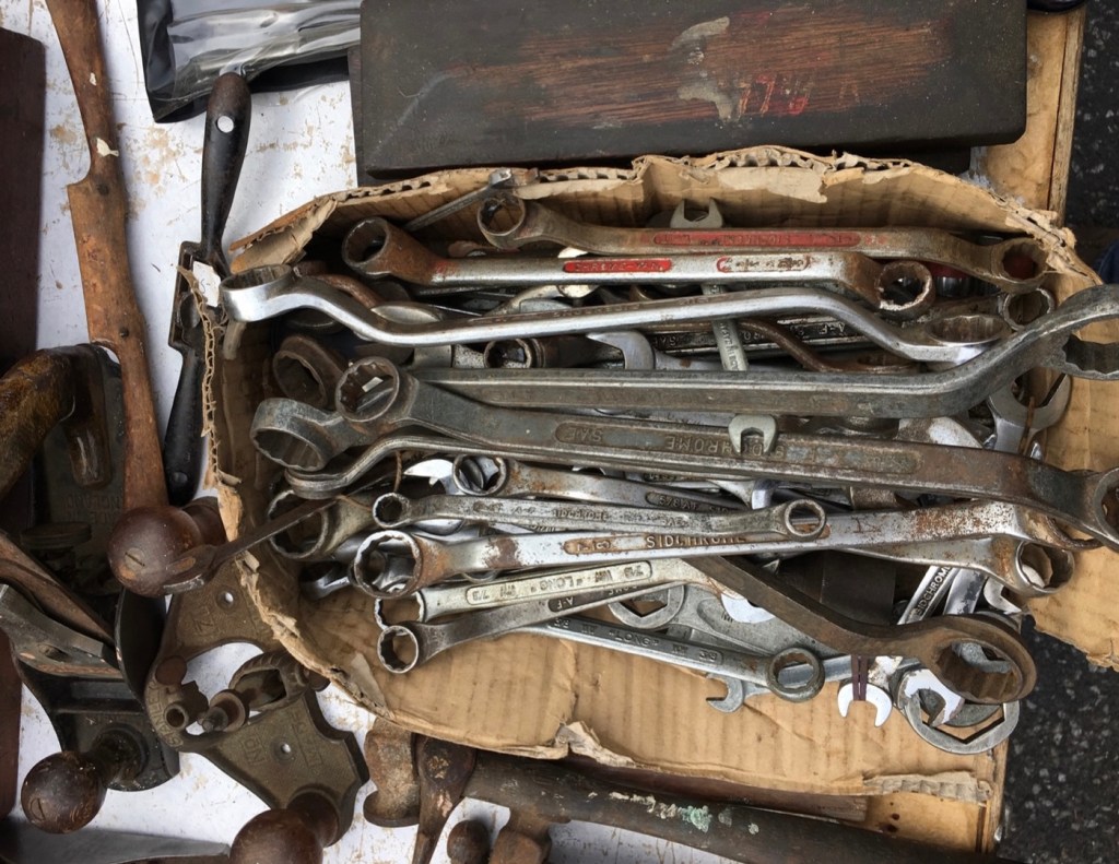 Old cricket and baseball bats, used golf clubs and tennis rackets plus bowls bags with balls, all bearing the character marks of previous use… all to be discovered!